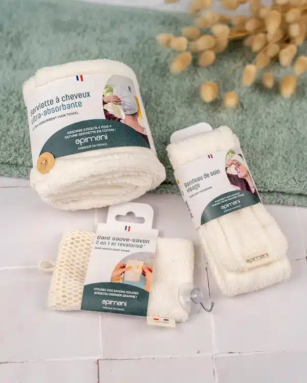 Composé de trois produits textile et d’une ventouse avec crochet, vous retrouvez les indispensables pour accompagner votre routine du matin et du soir.
